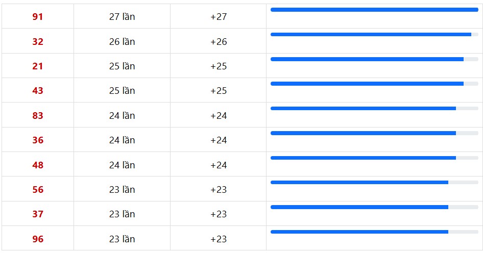 10 cặp số XSMN xuất hiện nhiều nhất trong 30 lần quay