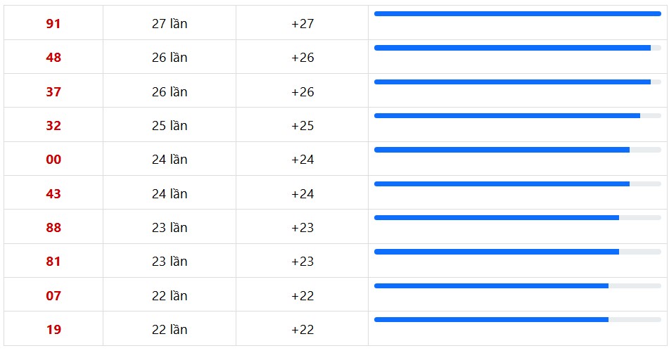 10 cặp số XSMN xuất hiện nhiều nhất trong 30 lần quay